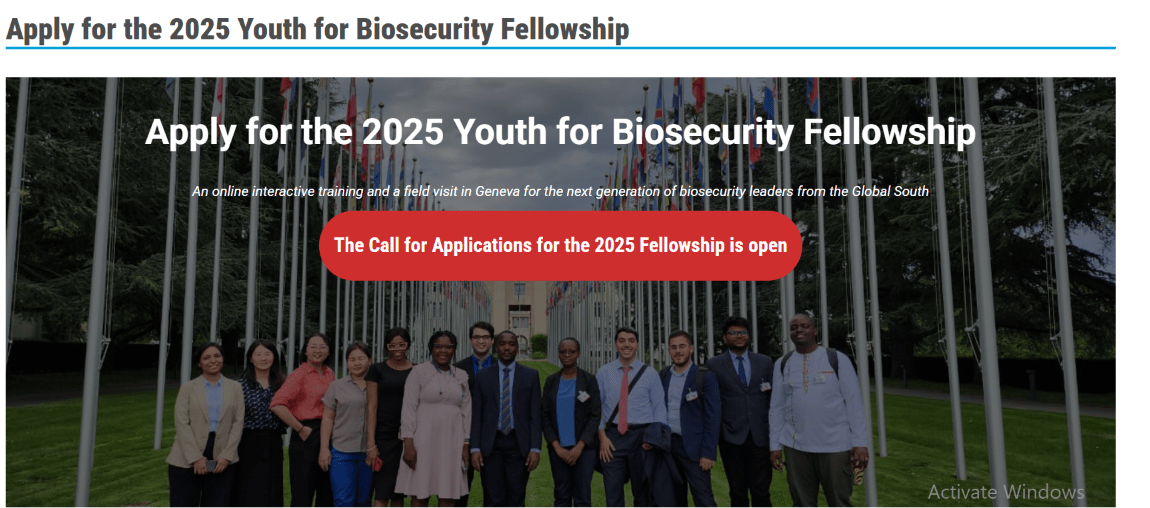 The UN Youth Biosecurity Fellowship 2025, organized by the United Nations Office for Disarmament Affairs (UNODA), is now open for applications. This fellowship is designed to empower young leaders by deepening their understanding of biosecurity and disarmament through a unique blend of online training and an immersive in-person experience.